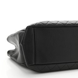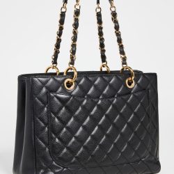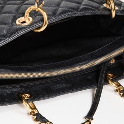 This is an authentic Grand Shopping Tote GST in Black. This stylish tote is crafted of diamond leather in black. The bag features leather threaded polished chain-link shoulder straps with leather shoulder pads. a prominent logo on the front. and a rear flat pocket. The top opens to a partitioned black satin interior with a central zipped compartment. zipper and patch pockets.