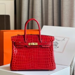Hermès Birkin 30 in Shiny Porosus Crocodile Leather in Rouge Vif with Gold Hardware