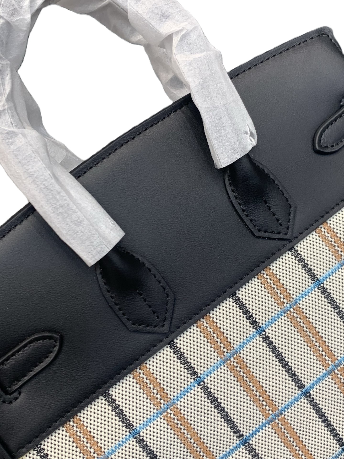 This Birkin Light 30 is in multicolor toile and black swift leather with palladium hardware and has tonal stitching, two straps with front toggle closure, clochette with lock and key and double rolled handles.