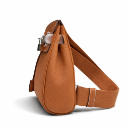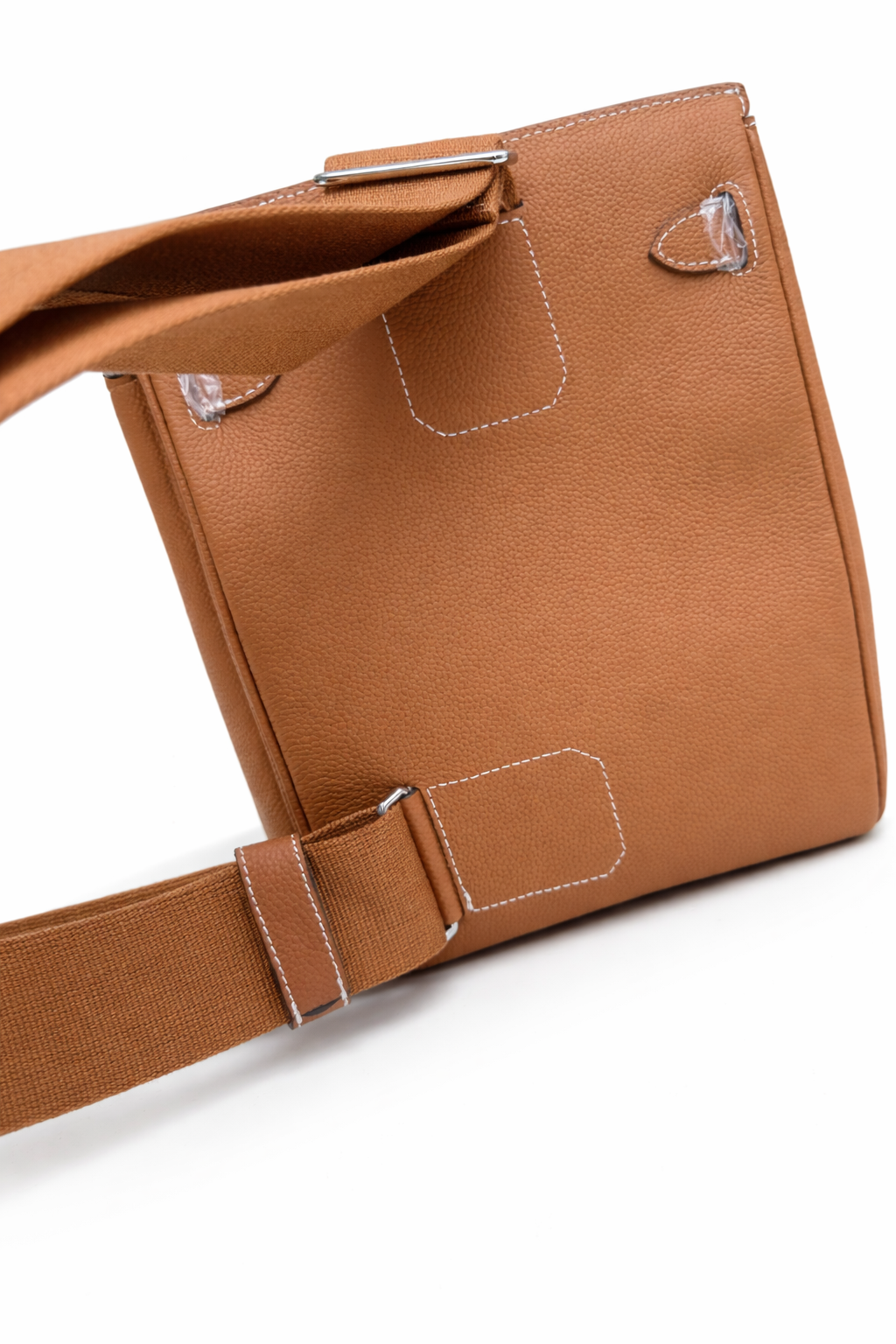 This HAC à Dos PM is crafted from gold Togo leather with palladium hardware, featuring tonal stitching, a front flap with signature turn-lock closure, and an adjustable canvas shoulder strap.